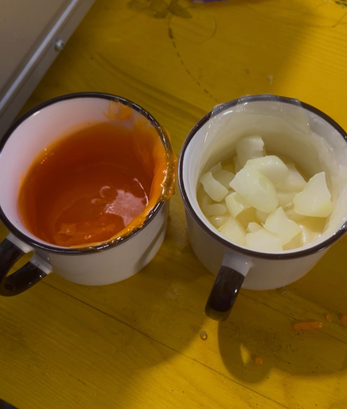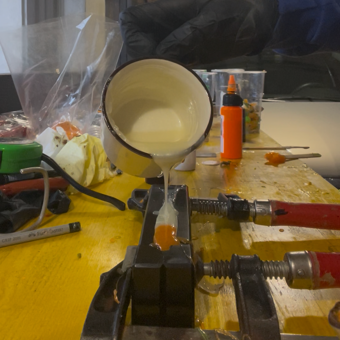 Next, I carefully pour the melted plastic into the mold. I do this slowly, calmly, and with full focus to ensure a clean and precise fill, avoiding spills and air bubbles.